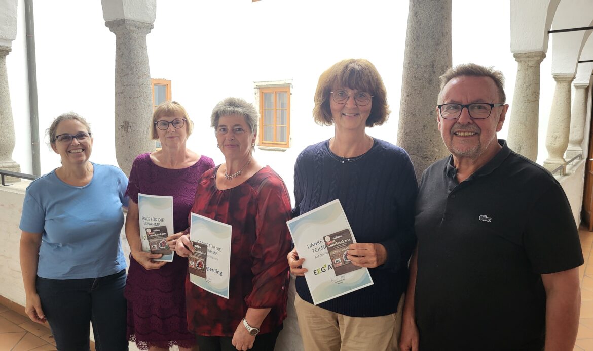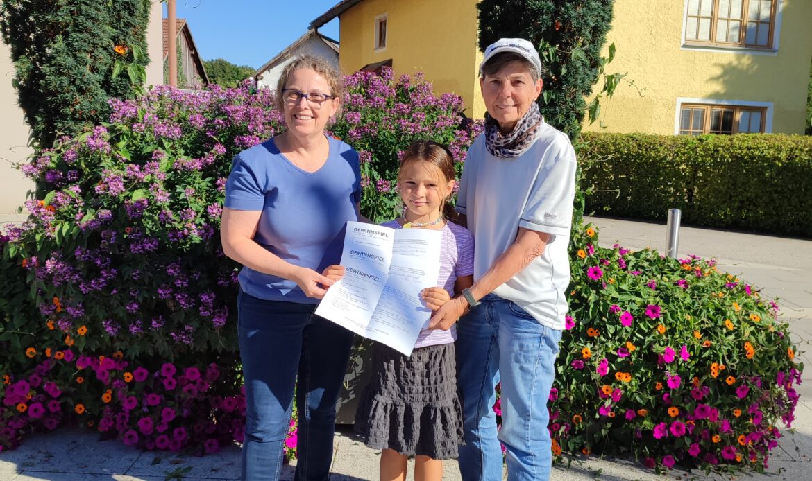 Die glücklichen Gewinnerinnen wurden von „Glücksfee“ Leonie Hermüller gezogen und durften sich über Gutscheine freuen. Zur feierlichen Übergabe der Preise traf man sich am 22.09.2025 im Schloss Sigharting. In gemütlicher Runde überreichte die EEG Aigerding die Gewinne an: