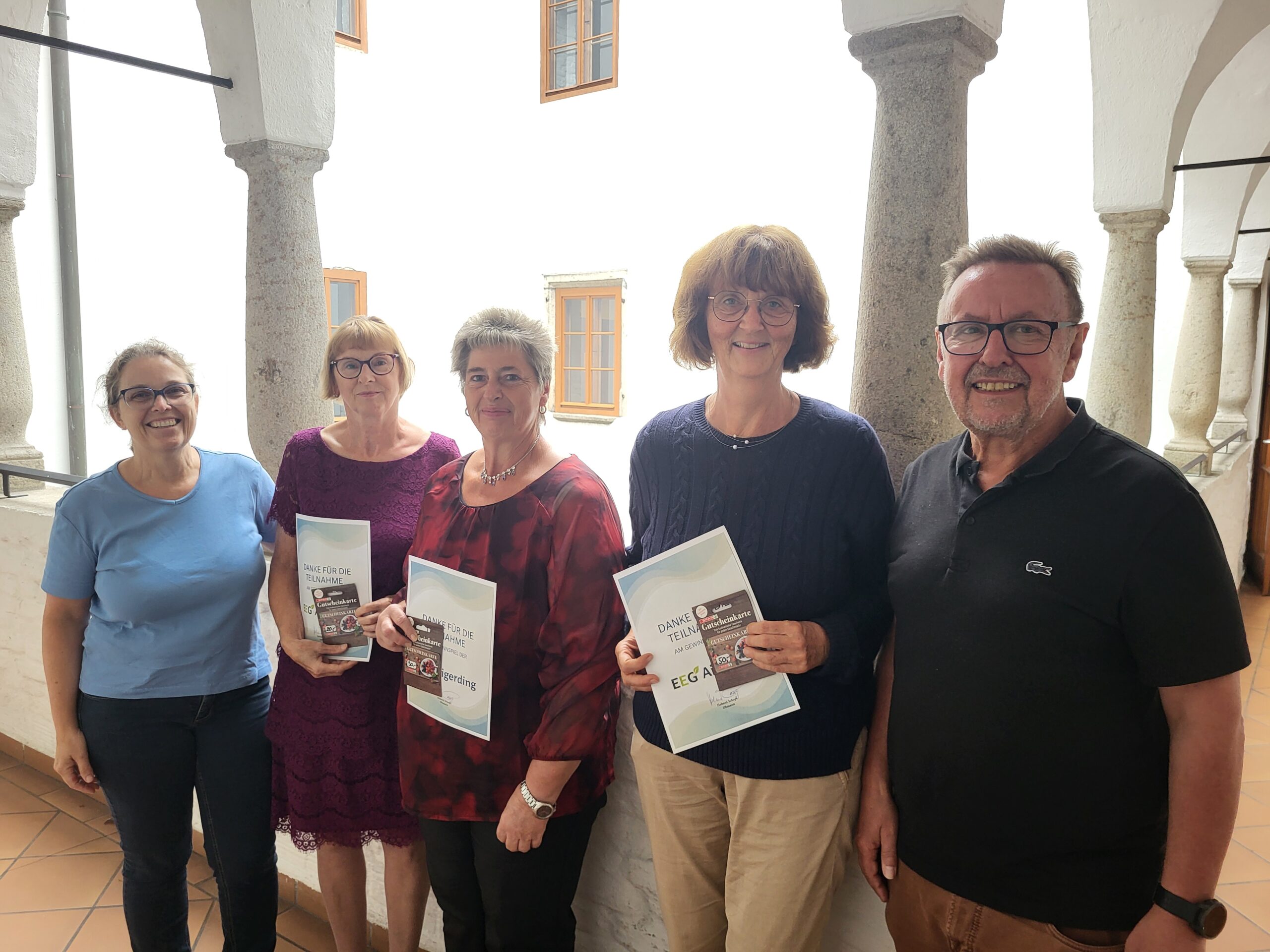 Die glücklichen Gewinnerinnen wurden von „Glücksfee“ Leonie Hermüller gezogen und durften sich über Gutscheine freuen. Zur feierlichen Übergabe der Preise traf man sich am 22.09.2025 im Schloss Sigharting. In gemütlicher Runde überreichte die EEG Aigerding die Gewinne an: